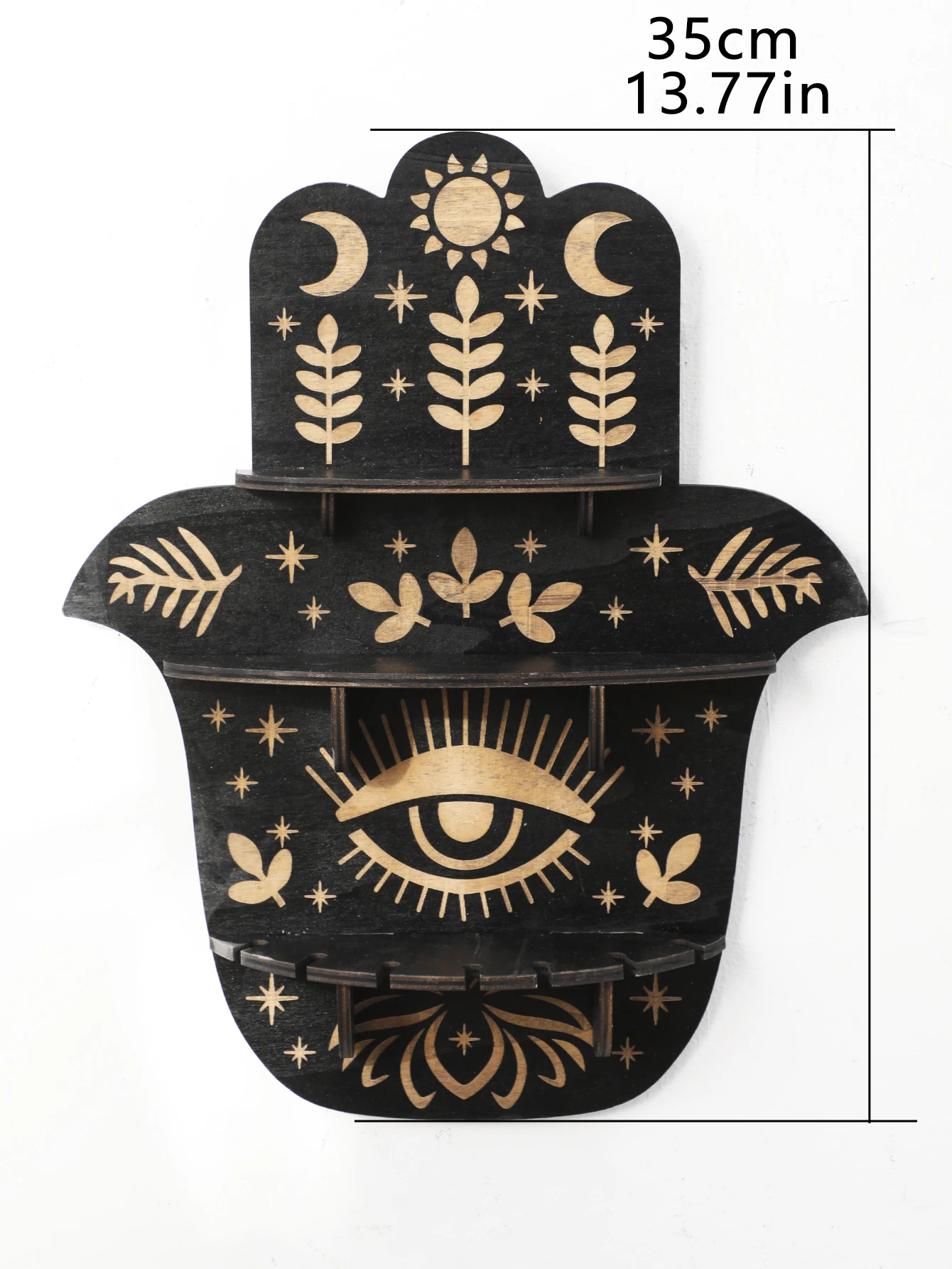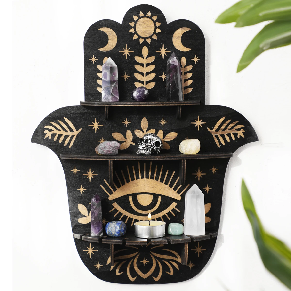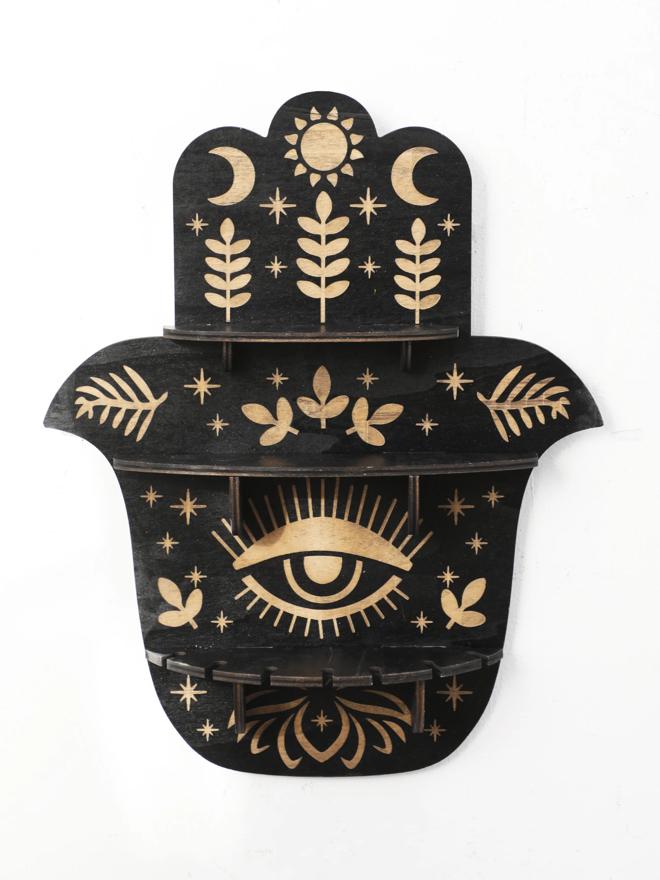 Black Wooden Wall Shelf Boho Hamsa Hand Shape Wall Decor Hanging Shelves Crystal Display Stand Ledge Evil Eye Gothic Home Decor