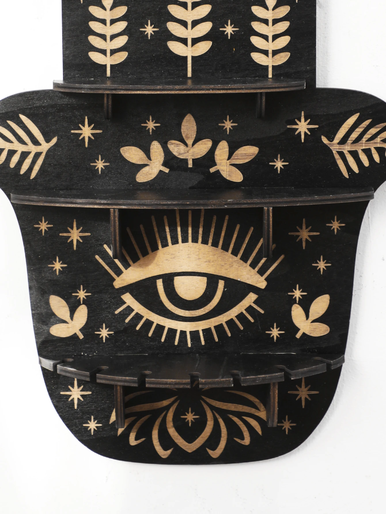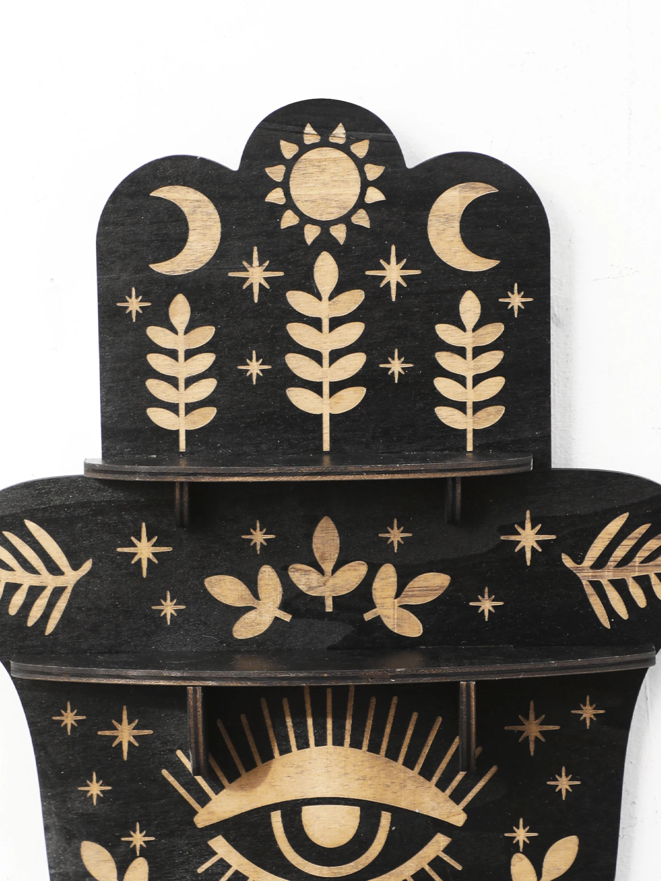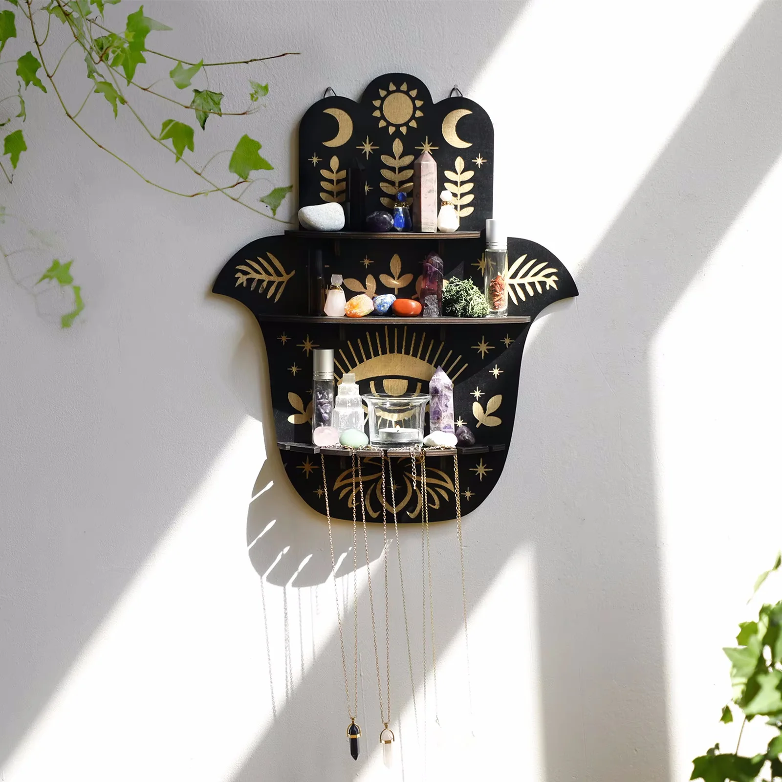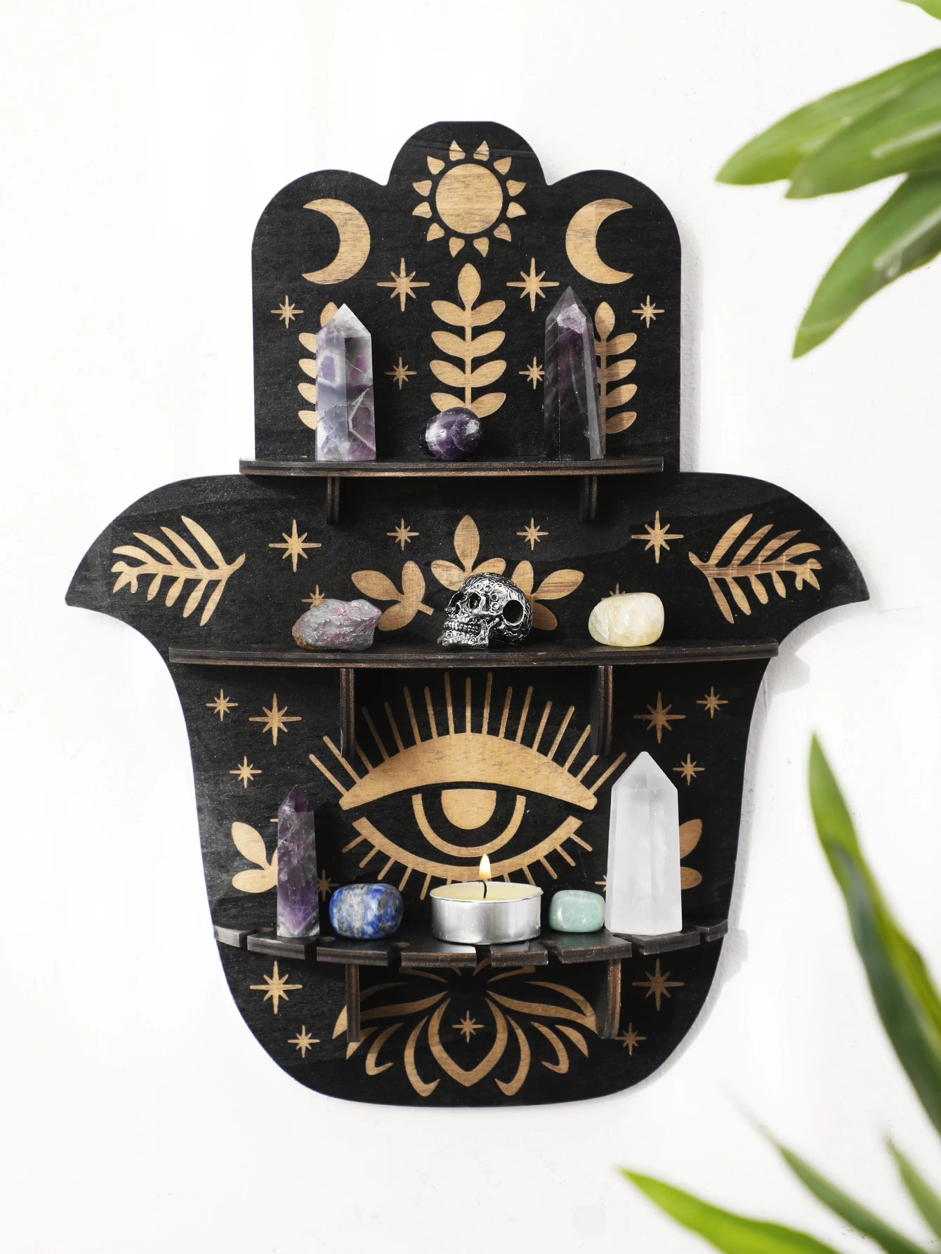 Black Wooden Wall Shelf Boho Hamsa Hand Shape Wall Decor Hanging Shelves Crystal Display Stand Ledge Evil Eye Gothic Home Decor